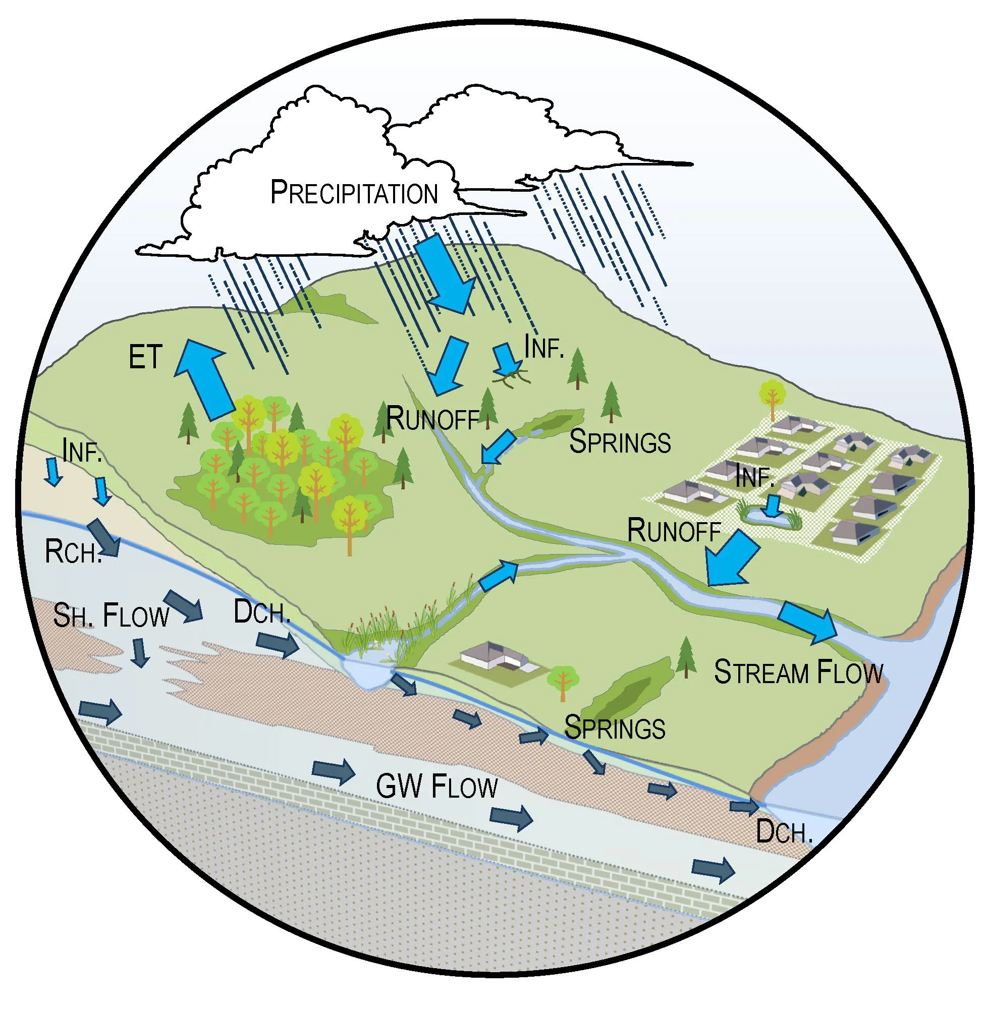 Integrated surface water-groundwater models (ISGMs) simulate surface water and groundwater systems within a single, cohesive numerical framework. These models dynamically represent interactions between surface water features, such as rivers, lakes, and wetlands, and the underlying groundwater system. This holistic approach offers a more accurate representation of the hydrologic cycle by capturing both water exchanges and the complex feedback mechanisms that influence key watershed functions and features.